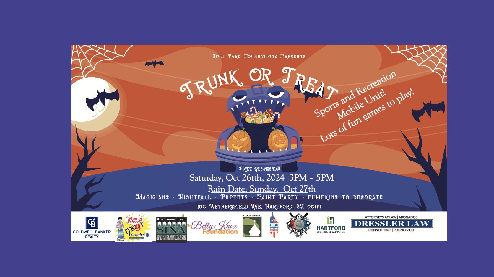 Colt Park Foundation presents Trunk or Treat. from 3 to 5 pm. Magicians, Nightfall Puppets, and pumpkins to decorate. Located at 100 Wethersfield Ave. Rain Date: Sunday October 27th. Click here to download flyer.